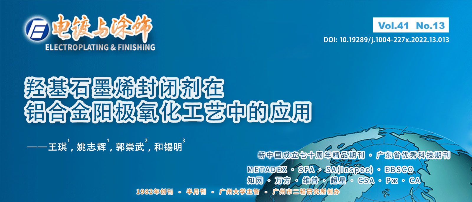 總經(jīng)理王琪、工程師姚志輝發(fā)表文章《羥基石墨烯封閉劑在鋁合金陽極氧化工藝中的應用》雜志是中文核心期刊、中國科技核心期刊、中國科學引文數(shù)據(jù)庫來源期刊、中國期刊方陣雙百期刊、CSCD中國科學引文數(shù)據(jù)庫來源期刊、北京大學《中文核心期刊要目總覽》來源期刊,被CA化學文摘(美)、SA科學文摘(英)、JST日本科學技術振興機構數(shù)據(jù)庫(日)(2018)、AJ)文摘雜志(俄)(2020)、中國知網(wǎng)、萬方數(shù)據(jù)知識服務平臺等收錄。